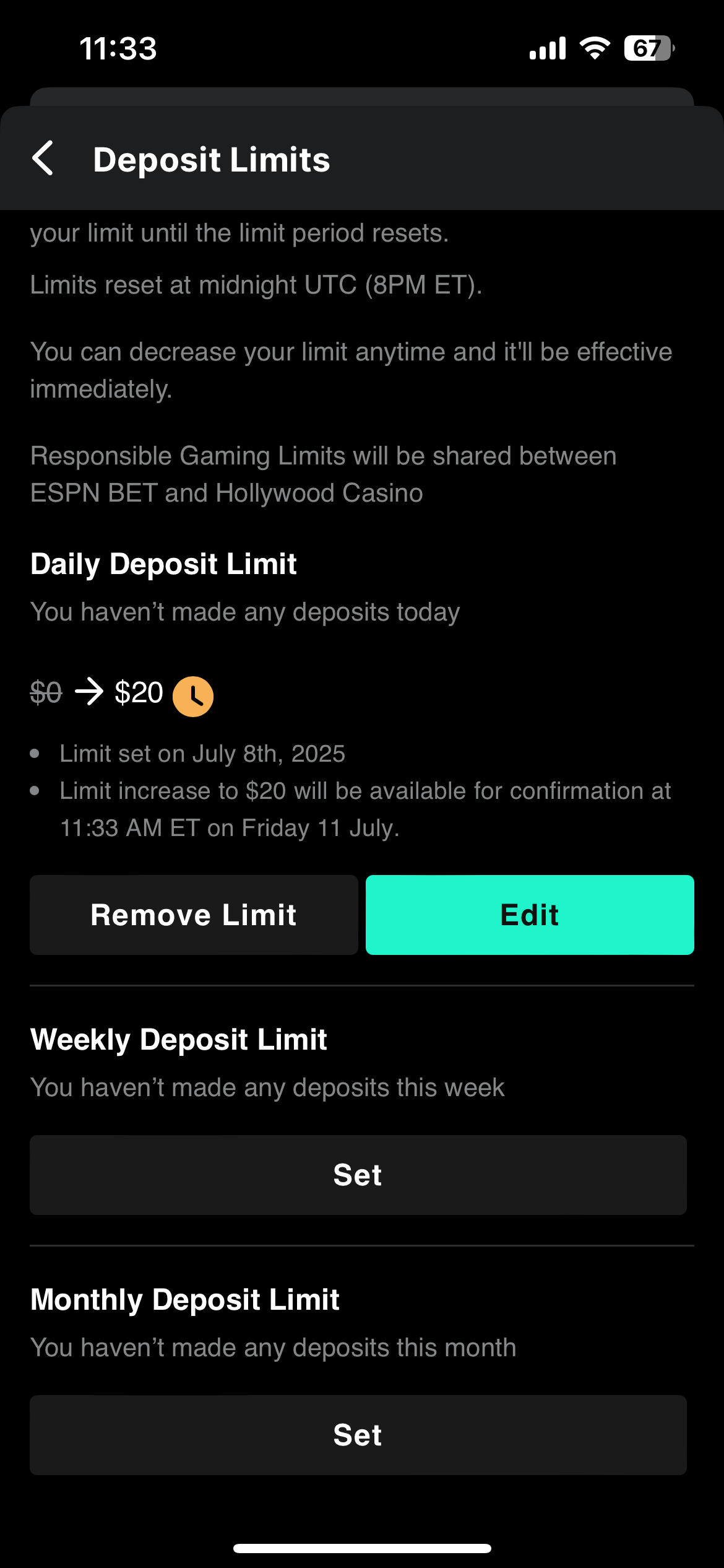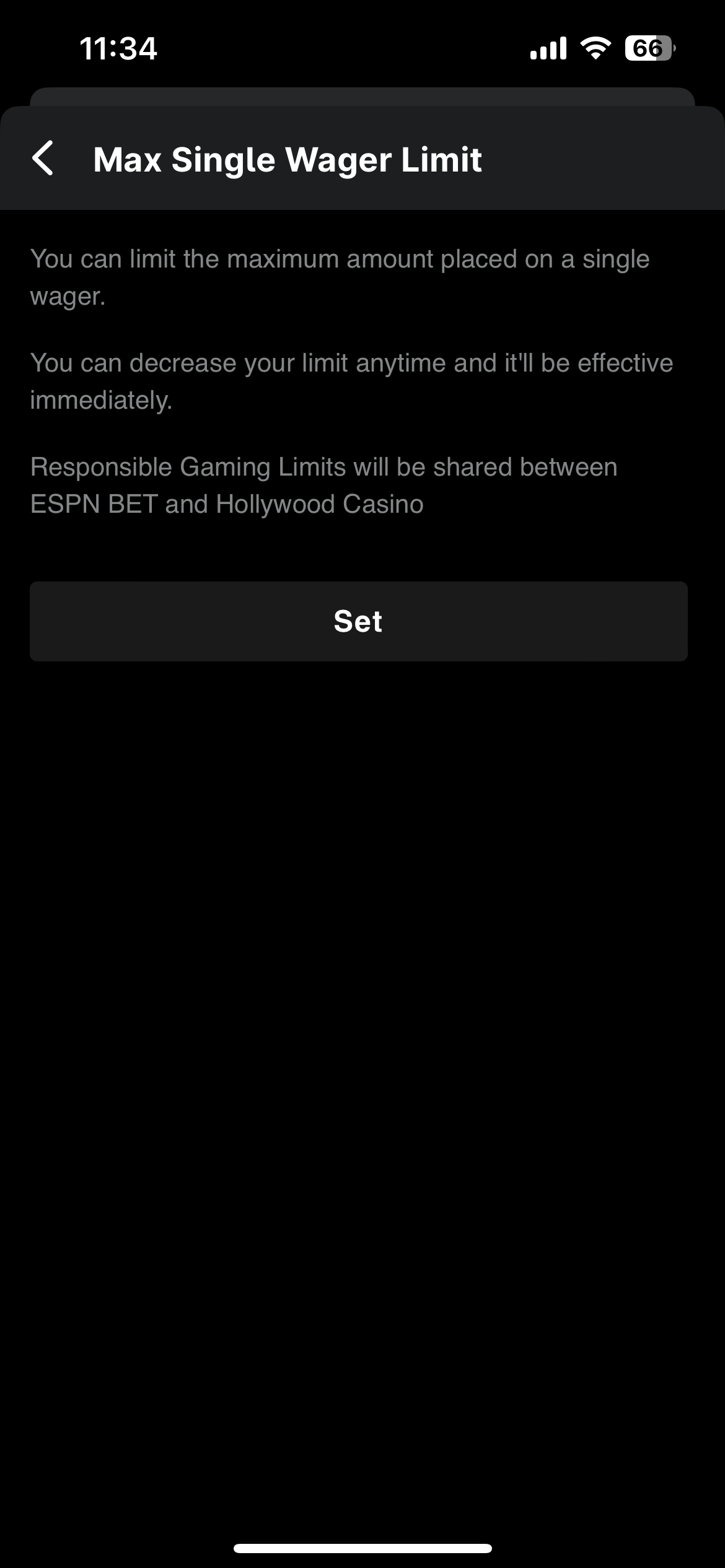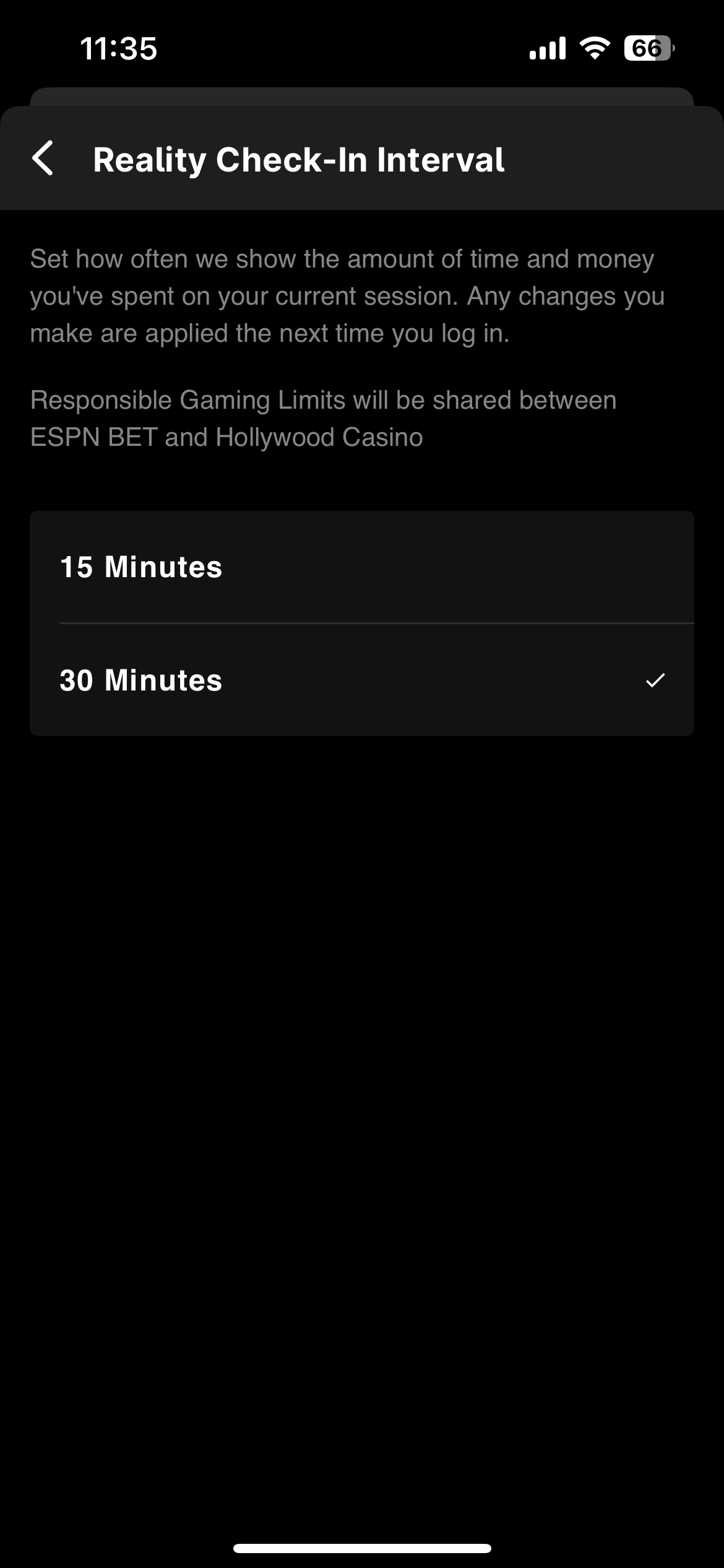 Daily Time Limit - Set a limit on the amount of time you spend on ESPN BET and Hollywood Casino per day. Once you hit your self-imposed daily time limit, you will be logged out and will no longer have access to ESPN BET and Hollywood Casino until it resets the following day.