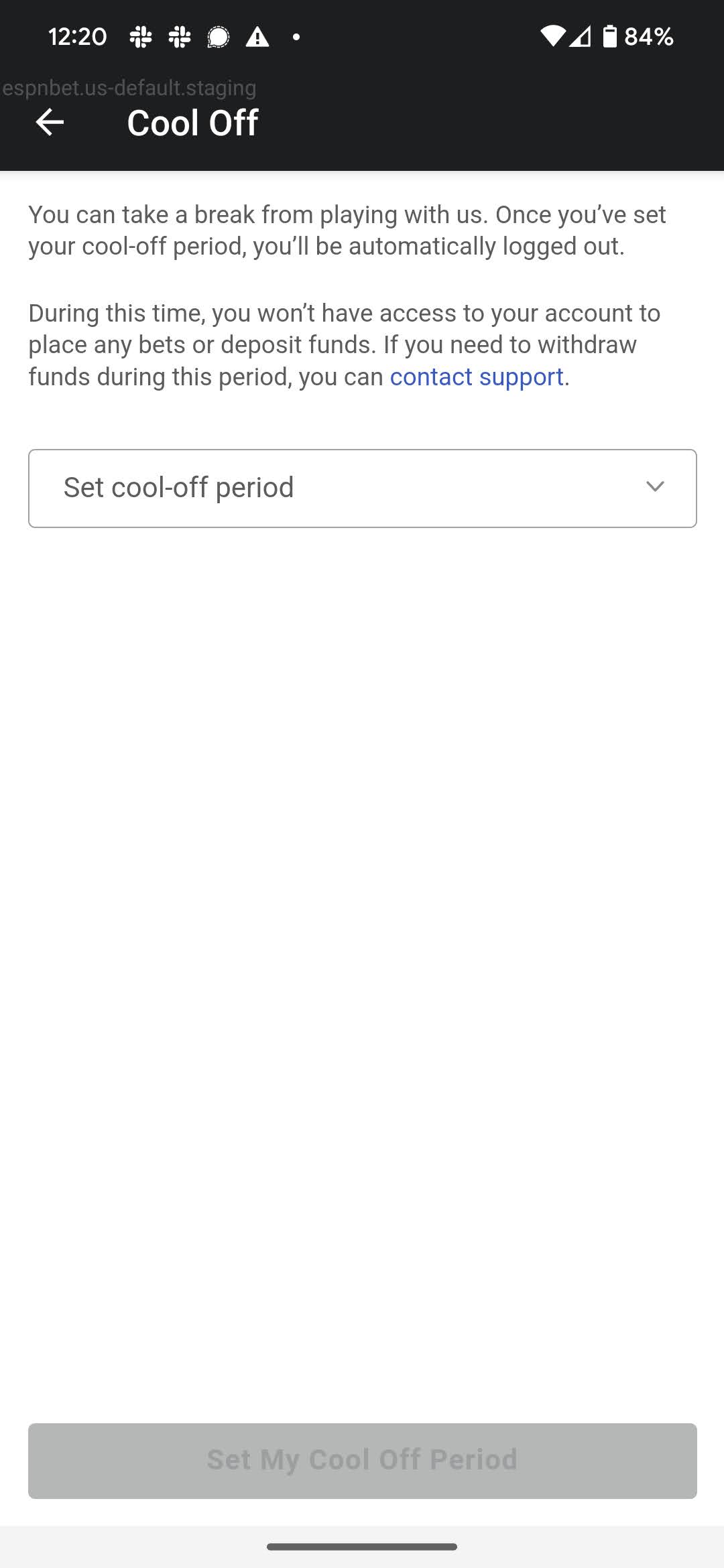 Cool Off - You can take a break from playing with us. Once you set a cool off period you select a period between 72 hours and 1 year you will automatically be logged out and will not have access to place any bets or make any deposits. After completion of your cool off period, you will be prompted on your next log in to continue to the wagering site or initiate another cool off period.