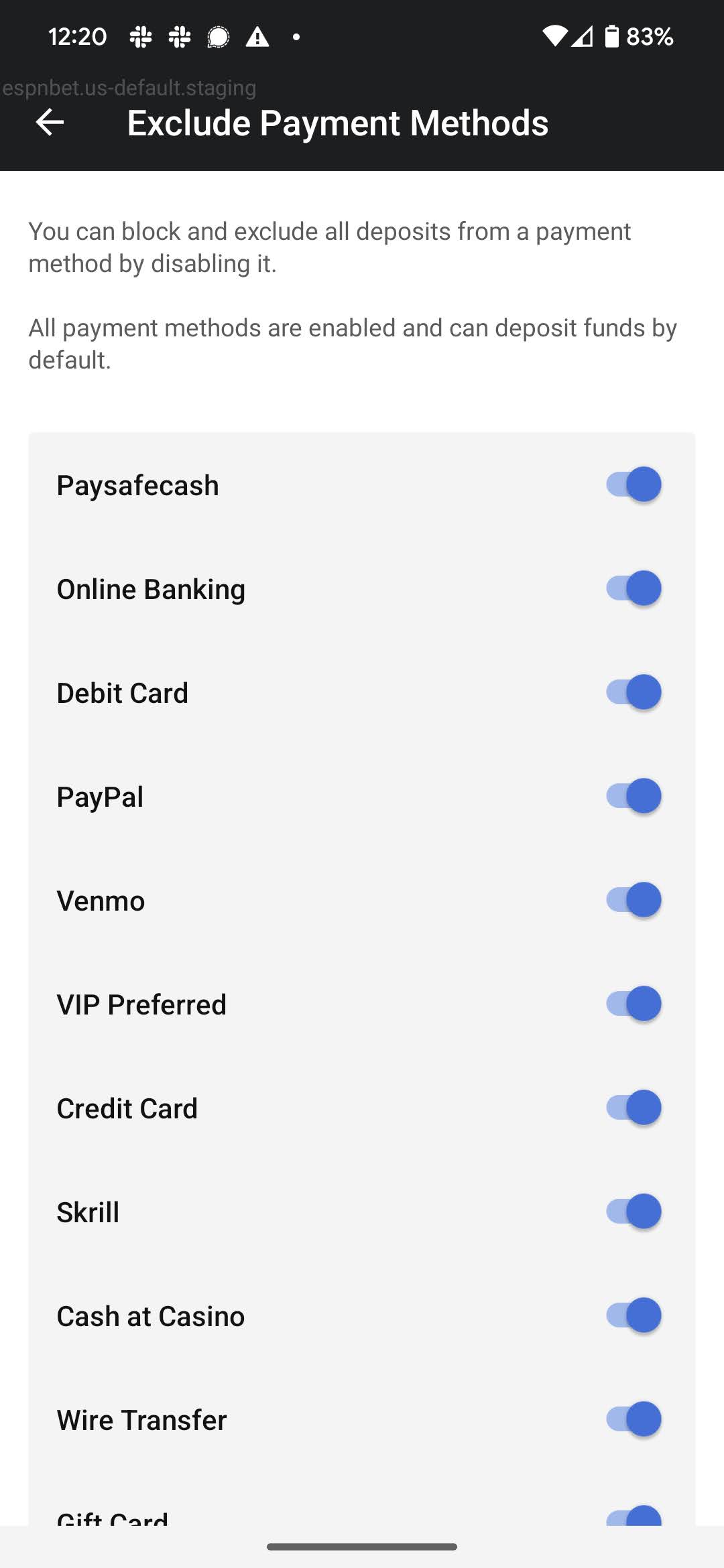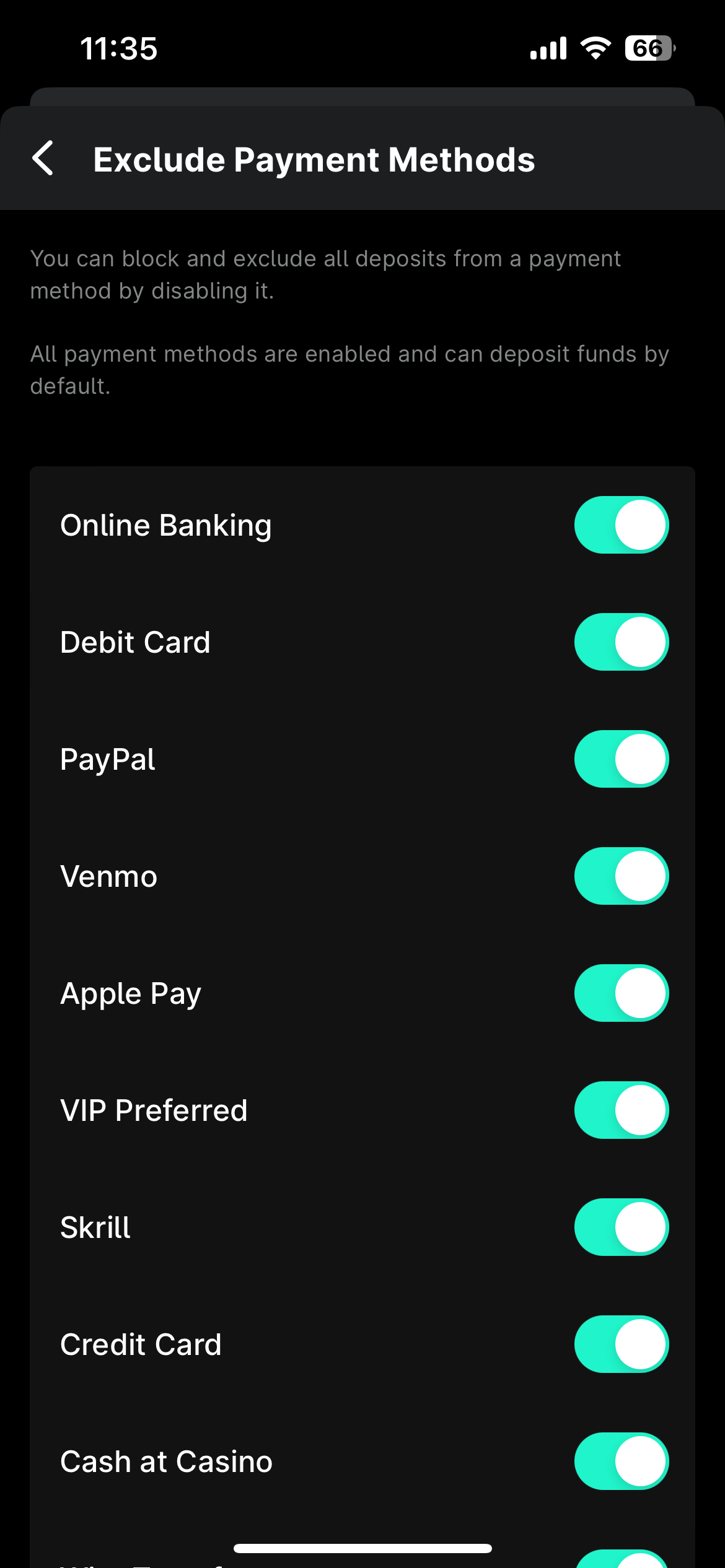 Exclude Payment Methods - You can block and exclude all deposits from a payment method by disabling it. All payments methods are enabled and can deposit funds by default.