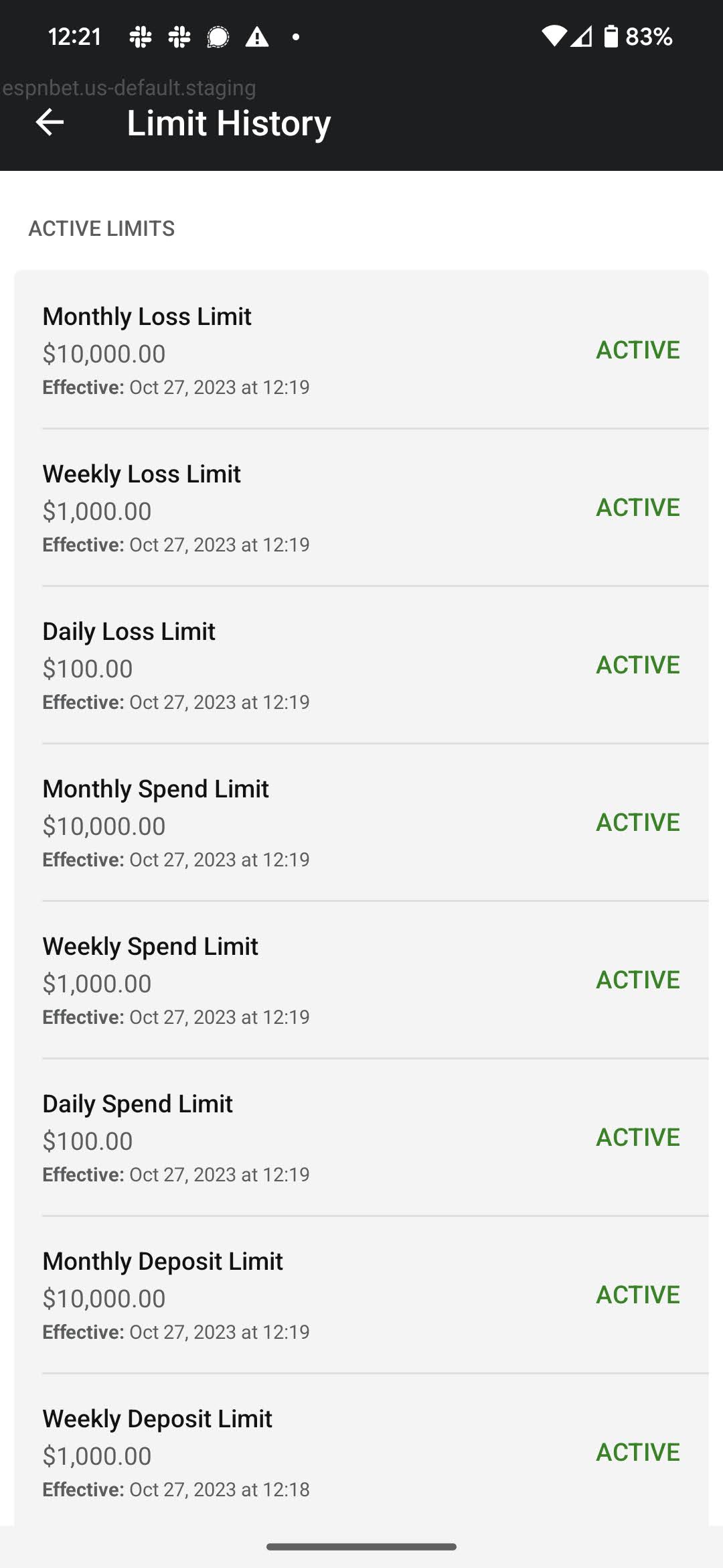 Limit History - To view all active and past limits set on your account, visit the Limit History section in the Responsible Gaming section.