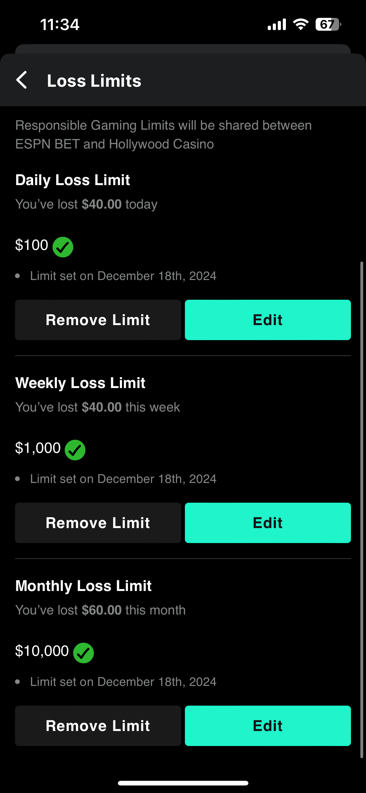 Click here to login to ESPN BET and Hollywood Casino and set Responsible Gaming Limits.