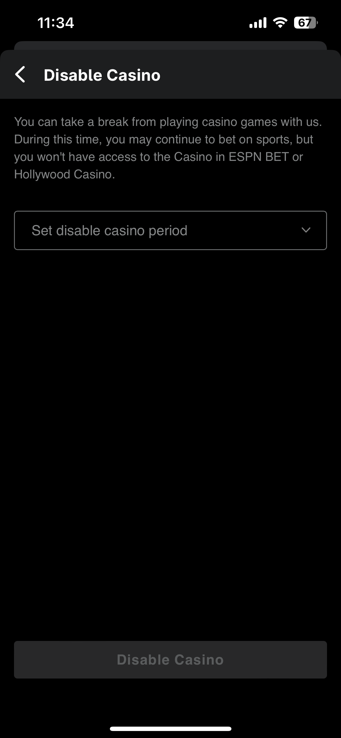 Disable Casino - Take a break from Hollywood Casino in the ESPN BET app lasting from 3 days to permanently. This feature allows you to continue to wager on your favorite sport events, but will prohibit you from entering the Hollywood Casino in the ESPN BET app or opening any Casino marketing material.